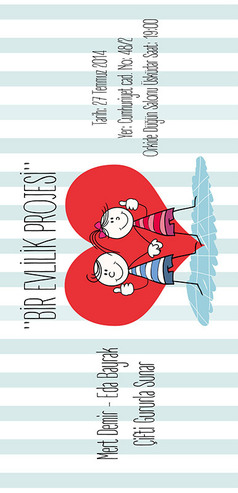 Aşkınızı sonsuzluğa giden bir film gibi anlatmak isterseniz, çeşitli tasarım ikonları ve onlarca zarf seçenekleri ile "Bir Evlilik Projesi" (21 cm x 10 cm) isimli davetiye bir tık uzağınızda sizleri bekliyor. "TASARLAMAYA BAŞLA" butonuna tıkladıktan sonra sınırınız sadece hayal gücünüz...