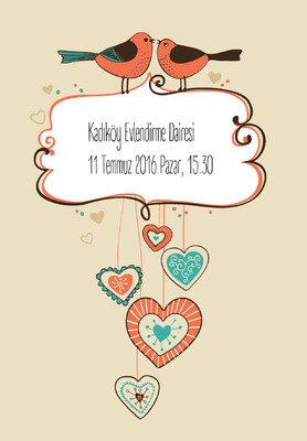 Mutluluğa kanat çırpmaya hazırsınız. Aşkınız ayaklarınızı yerden keserken sizi dünyayanın en mutlu insanı yapıyor. Artık bir ömür aynı yastığa baş koymaya hazılanırken en ciddi adımınızı da atmaya hazırsınız. Bu özel günde, çağrınızı tıpkı sizin gibi muhabbet dolu "Muhabbet Kuşları" (10 cm x 15 cm) davetiyeniz yapsın ister misiniz?