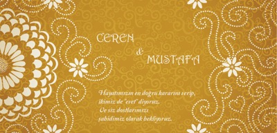 Sade ama şık bir davetiye arayışındaysanız "Ömür Boyu" ( 21 cm x 10 cm) düğün davetiyemiz mutlaka ilginizi çekecektir. Tasarımını beğendiyseniz hemen siparişinizi verebilir ya da kolaylıkla kullanabileceğiniz online tasarım panelimizle davetiyenizi kişiselleştirebilirsiniz.