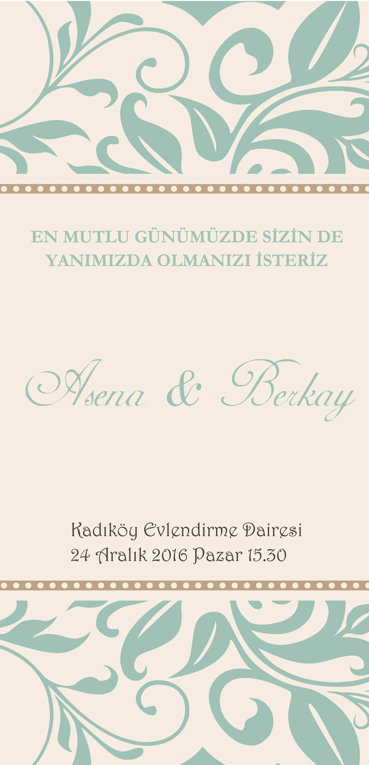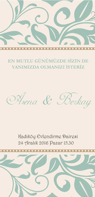 Bu güzel davetiyeyi hemen sipariş verebilirsiniz. Ya da sitemizde bulunan panel yardımıyla tasarımını değiştirebilir, yeniden düzenleyebilirsiniz. Bu işlemi kolayca ve tek tuşla halledebilir, düğününüz için planladığınız davetiye tasarımını kağıda dökme imkanı bulabilirsiniz.