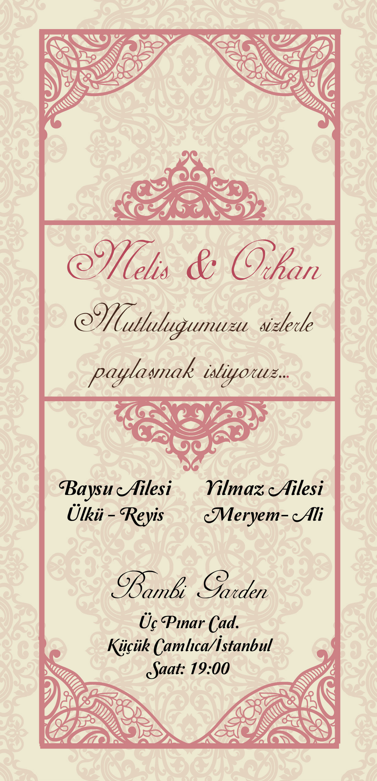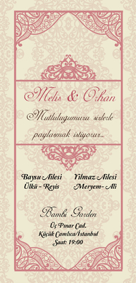 Pembe tasarımıyla özellikle gelin adaylarının gönlünü ayrı bir fethedecek bu davetiye ile ileride çocuklarınıza göstereceğiniz en güzel tasarıma sahip olun. Sizin kullanımınıza sunulmuş tasarım panelimiz ile davetiyenizi dilediğiniz gibi düzenleyin, hayallerinizdeki tasarımı kağıda dökme imkanını yakalayın!