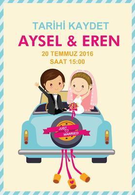 Düğün davetiyenizin farklı olmasını tercih ediyor ve piyasa bulunan davetiye tasarımlarını sıkıcı buluyorsanız size güzel bir haberimiz var: Karikatür çizimli "Tarihi Kaydet" (10 cm x 15 cm) davetiyesi ile tüm konuklarınıza en farklı şekilde düğün çağrınızı yapabilirsiniz.