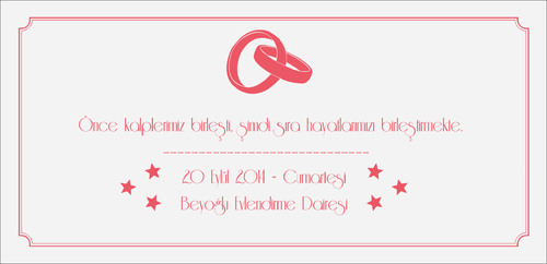 Davetiye seçiminde kararsız kaldıysanız ve renkli, canlı bir davetiye istiyorsanız "Pembe Gönlüm Sende" (21 cm x 10 cm) düğün davetiyesi olarak çok güzel bir seçim olacak.
