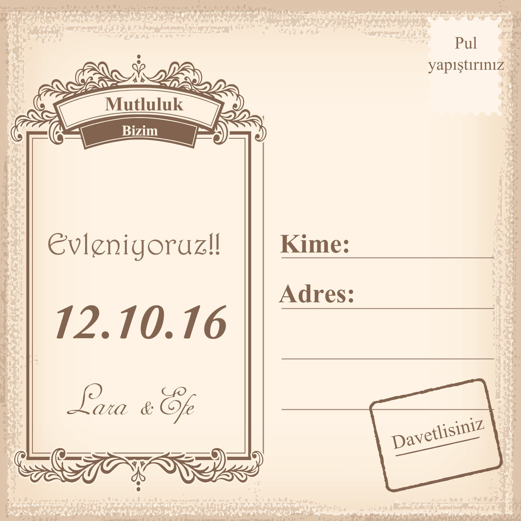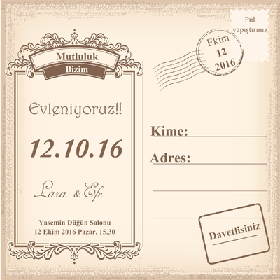 Düğün hazırlıklarınız sürerken davetiye işlerinizi tamamlamak ve bu sürecin en kafa karıştırıcı kısmından kurtulmak için "Aşk Mektubu" (15 cm x 15 cm) davetiyesini hemen sipariş verebilisiniz. "Davetiyeme benim elim değmeli" diyorsanız eğer, sizi tasarım panelimize davet ediyoruz. Hiçbir grafik bilgisi olmadan tek tuşla tasarımınızı tamamlayabilirsiniz.