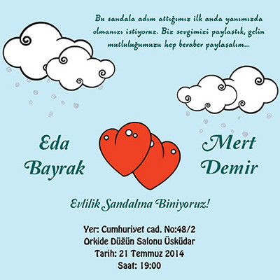 Geleceğe birlikte kürek çekecek çiftlere özel "Evlilik Sandalı"  (15 cm x 15 cm) davetiyesini online olarak tasarlayıp  baskı talebinde bulunabilirsiniz. Size özel sözlerle, düğün tarihi ve mekanını da ekleyerek oluşturacağınız şirin mi şirin davetiyenizi  keyifle misafirlerinize gönderebilirsiniz.