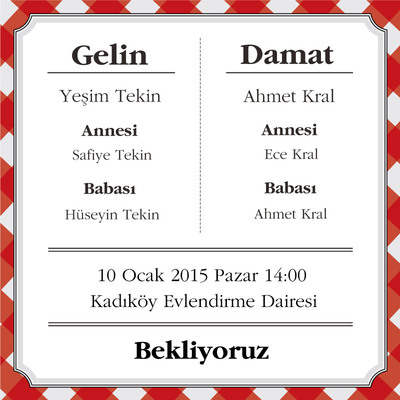 Bu menünün üstüne güzel bir düğün pastası iyi gider. Bir tıkla özgün davetiyenizi  hemen tasarlamaya başlayın.