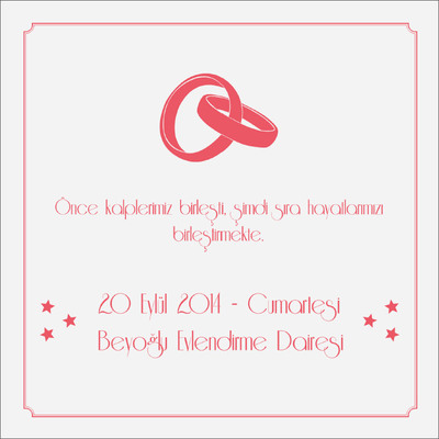 Aşık olduğunuz rengi ve düğün davetiyenizi  bulduktan sonra kendi tasarımınızı oluşturmak çok kolay! Bu arada müstakbel eşe düğün arifesinde verilecek romantik mesajı es geçmeyelim: “Pembe gönlüm sende”. Gönlünüzü verdiğiniz renk ve eş bir arada mükemmel bir konsept oluşturacak. "Pembe Gönlüm Sende"  (15 cm x 15 cm) tasarımını  kişiselleştirmek için şablonlardan yararlanabilir, kendi fotoğraflarınızı ve metninizi tasarıma ekleyebilirsiniz. Davetiye  üzerindeki isim, düğün yer ve zamanını değiştirmeyi unutmayın.