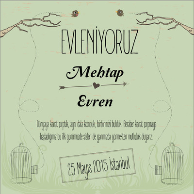 Sizi tam anlamıyla tanımlayacak "Yuvadan Uçanlar" (15 cm x 15 cm) düğün davetiyesi hem eğlenceli hem anlamlı bir seçim. Davetiyenize ufak dokunuşlar yapmak isterseniz tasarım paneli yardımınıza koşuyor. Farklı grafikler ve renkler kullanmanıza imkan veren yazılımı ile herkesten farklı davetiyelerinizin olmasını sağlıyor.