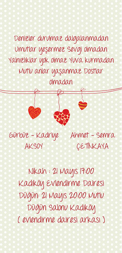 İsterseniz kuş kanadı gibi coşkulu şiirler, şarkı sözleri ekleyebilir veya sevdiğinizle bu güne kadar çektirdiğiniz romantik fotoğraflardan yükleyebilirsiniz. Düğün davetiyenizin tasarımında kuşlar kadar özgüsünüz!