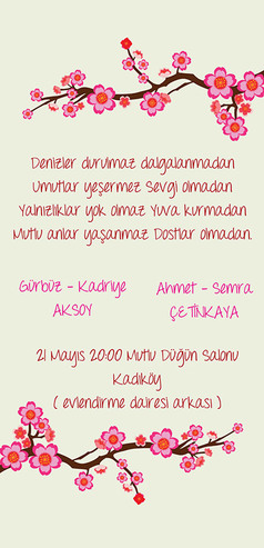 Özellikle düğün davetiyelerinde modern bir tarz yakalamak isteyenlere hitap eden "Aşk Kuşları" düğün davetiyesi ile duygularınızı en tatlı şekilde yansıtacaksınız. Ön yüzünde mutluluğunuzu en iyi şekilde anlatan çifte kumrular ve pembe çiçeklerle süslü davetiye ile arkadaşlarınızı kıskandıracaksınız.