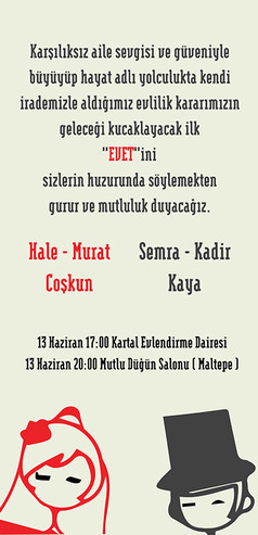 Keyifli, neşeli bir davetiye arıyorsanız "Bay ve Bayan Mükemmel" (10 cm x 21 cm) ile fark yaratan, eşinizle gülümseyerek hatırlayacağınız bir anı belgesine sahip olacaksınız. Kendi görsel zevkinize uygun olarak, online tasarlayabileceğiniz bu davetiye tamamen sizin beğeninizle hazırlanıp, dilediğiniz sayıda bastırılarak en kısa zamanda adresinize ulaştırılacak.