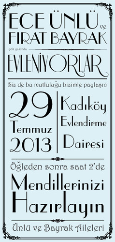 Online tasarım sistemini kullanarak sizin için hazırlanılanmış grafiklerle, isterseniz de kendi fotoğraflarınızı yükleyerek davetiyenizi oluşturabilirsiniz. Sadece isimlerinizi ve düğün bilgilerinizi değil, tüm metinleri aşkınızı anlatan size özel cümleler kullanabilirsiniz. Hazır olunca geriye kalan tek şey sipariş vermek...