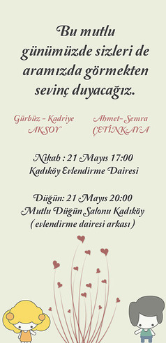 Görenlerin "Tam sizlik olmuş!" diyecekleri bu davetiye tasarımıyla , ne kadar eğlenceli ne kadar renkli bir çift olduğunuzu da davetlilerinize göstermiş olacaksınız. Aklınızda olan diğer fikirleri de davetiyenize yansıtmanız mümkün. Çizimlerden fotoğraflara, yazılardan renkli objelere davetiyenize yansıtacağınız pek çok seçenek tasarım panelimizde mevcut.