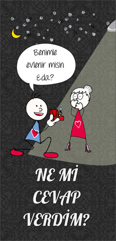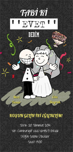 Bu davetiye tasarımına karar verdikten sonra geriye yapmanız gereken tek bir şey kalıyor; davetiyenizi birkaç dokunuşla hazır hale getirmek. SevgiliKitabi.com'a tıklayıp davetiye seçenekleri arasından "Sonumuz Evet Olsun" u (10 cm x 21 cm) seçmek ve online olarak davetiyenizi hazırlamaya başlamak.