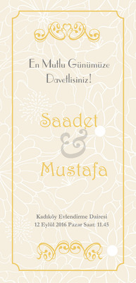 Aşkınızı özel bir şekilde gösterecek bir davetiye her çift için önemlidir. O özel güne ait özel anıların başında gelen düğün davetiyeleri , düğün sahiplerinin zevkini yansıtmalı, onların istediği bir tasarıma sahip olmalıdır. "Umut Işığım" (10 cm x 21 cm) dostlarınıza aşkınızın hiç azalmayacağını anlatacak bir tasarıma sahip. Bu düğün davetiyesi ile duygularınızı en sevimli şekilde yansıtacaksınız.